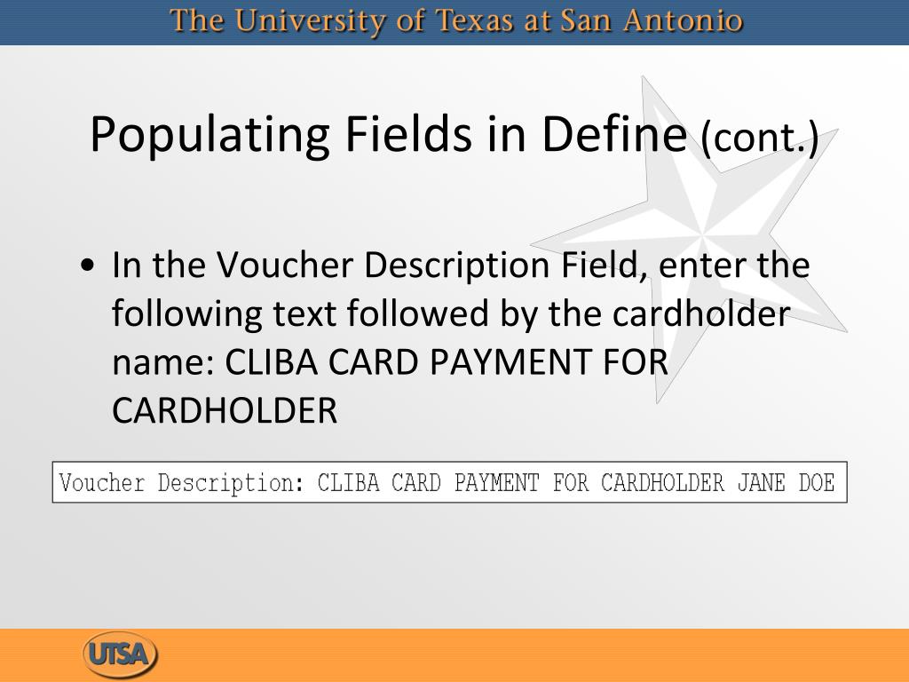Populating Fields in Define (cont.) • In the Voucher Description Field, enter the following text followed by the cardholder name: CLIBA CARD PAYMENT FOR CARDHOLDER