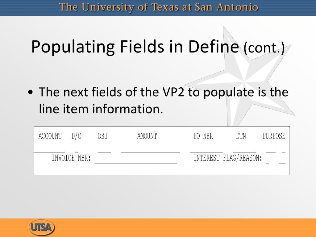 Populating Fields in Define (cont.) • The next fields of the VP2 to populate is the line item information.