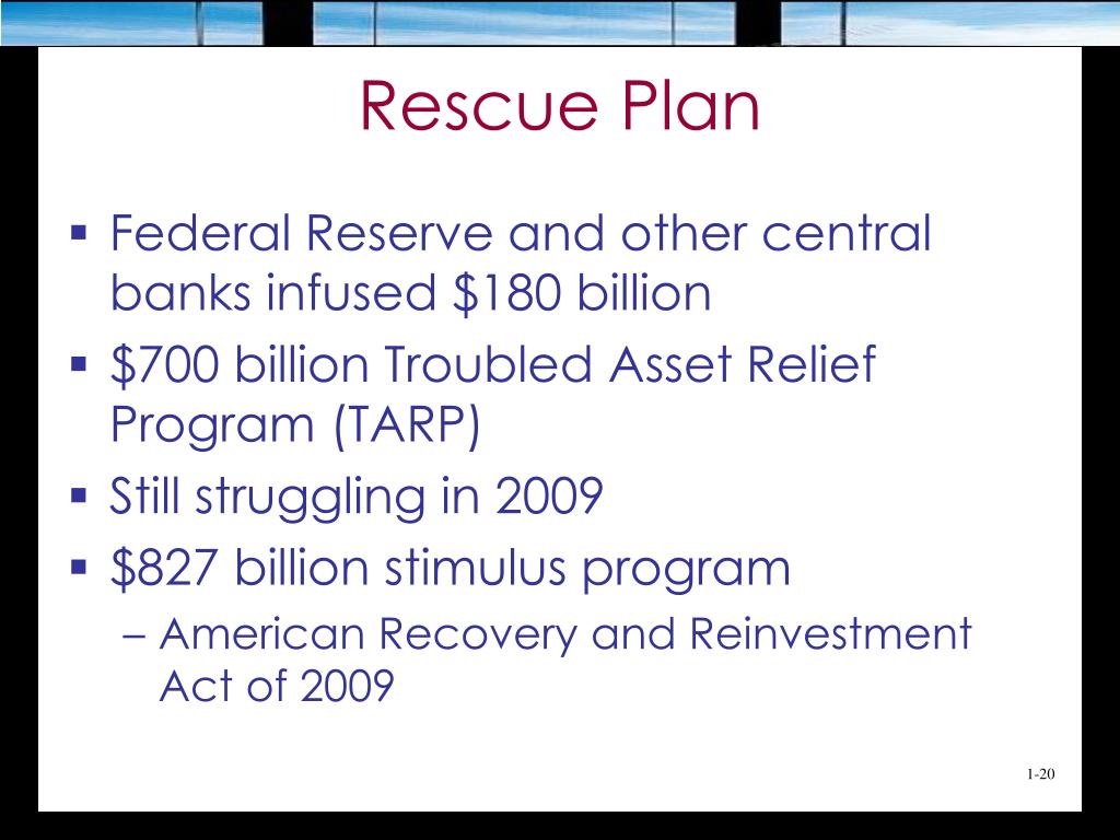 Rescue Plan • Federal Reserve and other central banks infused $180 billion • $700 billion Troubled Asset Relief Program (TARP) • Still struggling in 2009 • $827 billion stimulus program • American Recovery and Reinvestment Act of 2009