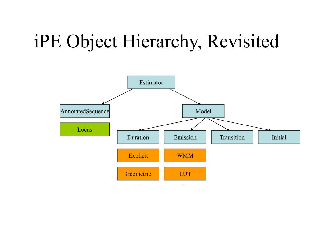 iPE Object Hierarchy, Revisited Estimator AnnotatedSequence Model Locus Duration Emission Transition Initial Explicit WMM Geometric LUT … …