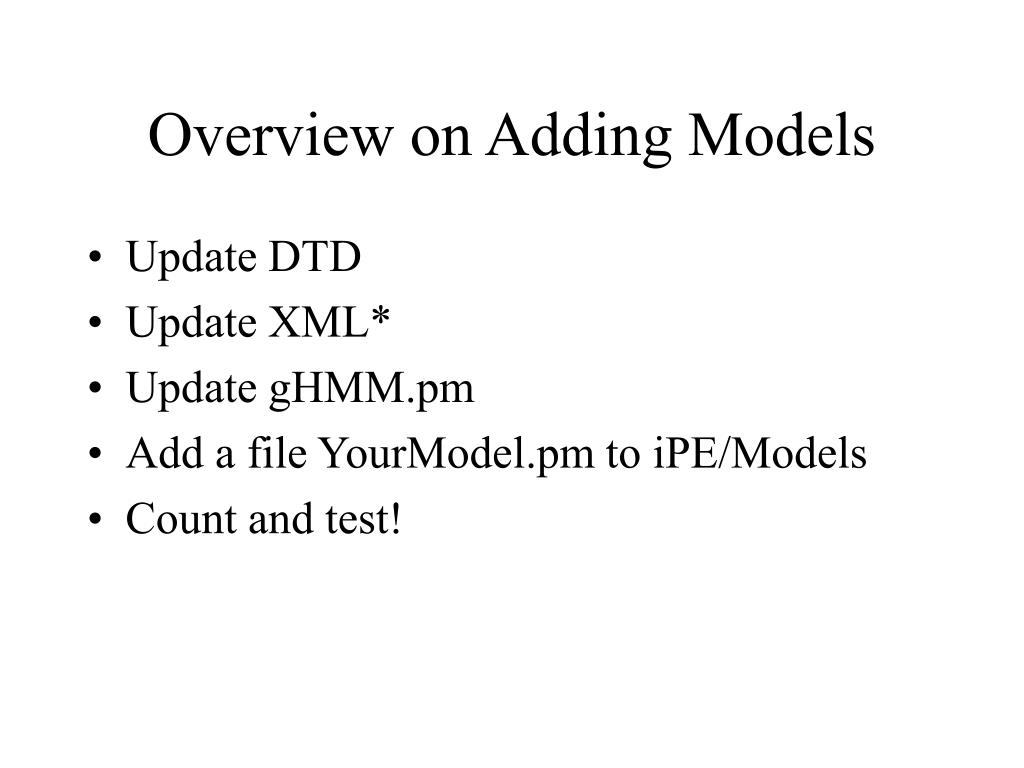 Overview on Adding Models • Update DTD • Update XML* • Update gHMM.pm • Add a file YourModel.pm to iPE/Models • Count and test!