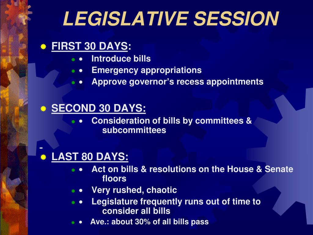 LEGISLATIVE SESSION • FIRST 30 DAYS: • ·Introduce bills • ·Emergency appropriations • ·Approve governor’s recess appointments • SECOND 30 DAYS: • ·Consideration of bills by committees & subcommittees • LAST 80 DAYS: • ·Act on bills & resolutions on the House & Senate floors • ·Very rushed, chaotic • ·Legislature frequently runs out of time to consider all bills • ·Ave.: about 30% of all bills pass