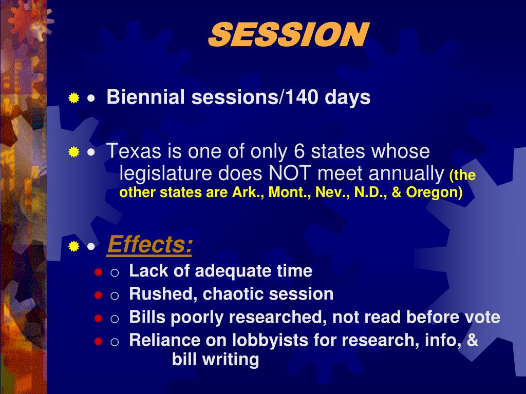 SESSION • ·Biennial sessions/140 days • · Texas is one of only 6 states whose legislature does NOT meet annually(the other states are Ark., Mont., Nev., N.D., & Oregon) • ·Effects: • oLack of adequate time • oRushed, chaotic session • oBills poorly researched, not read before vote • oReliance on lobbyists for research, info, & bill writing