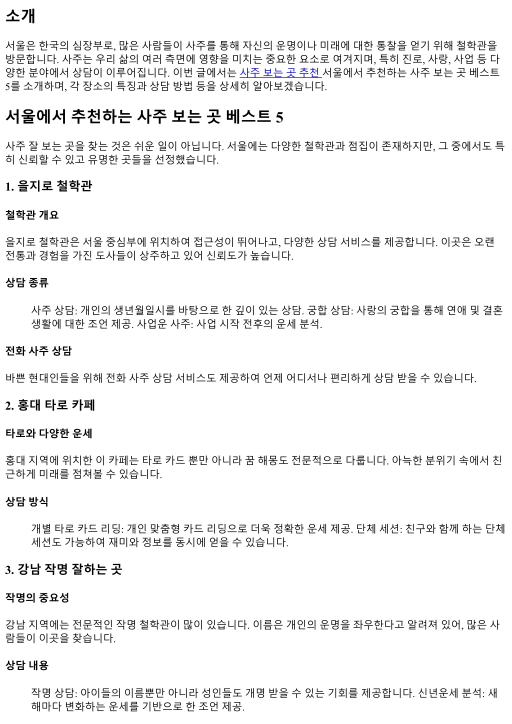 2. 4. 종로무속인집 무속신점과점술 종로에위치한무속인집은전통적인한국무속예술을바탕으로여러가지점술서비스를제공합니다. 상담종류 신점상담: 신령님께직접질문하고답변받는형태. 신년운세및띠별운세체크: 매년달라지는띠별운세 를통해한해동안의방향성을제시합니다. 5. 명동무료운세카페 무료서비스제공 명동지역에는무료운세서비스를제공하는카페가많아누구나쉽게접근할수있습니다. 상담특징 오늘의운세: 매일업데이트되는오늘의운세를통해일상생활에서유용한팁을제공합니다. 꿈해몽세션: 꿈에대한해석도가능하여더깊은이해를돕습니다. FAQ Q1: 사주는어떻게구성되나요? A1: 사주는태어난시각과날짜를기준으로음양오행론과천간지지를조합하여만들어집니다. Q2: 전화사주상담은신뢰할수있나요? A2: 전문적인철학관에서는전화상담도매우신뢰할수있으며, 실시간으로궁금증을해결해줍니다. Q3: 궁합잘보는곳은어디인가요? A3: 을지로철학관과같은전문적인장소에서궁합상담을받을수있습니다. Q4: 작명잘하는곳은어떻게찾아야하나요? A4: 온라인리뷰나가족및친구들의추천으로찾는것이좋습니다. 강남지역에는많은전문가가있습니다. Q5: 무료운세카페는어떤서비스를제공하나요? A5: 무료운세카페에서는오늘의운세및기본적인점술서비스가가능합니다. Q6: 타로와사주의차이는무엇인가요? A6: 타로는카드리딩기반의점술이며, 사주는생년월일시를기반으로하는더체계적인분석입니다. 결론 서울에서추천하는사주보는곳베스트 5는각기다른특성과전문성을가지고있어다양한니즈를충족시켜줍 니다. 여러분이궁금한사항이나고민거리가있다면위에서소개한장소들을방문해보세요. 각기다른경험과