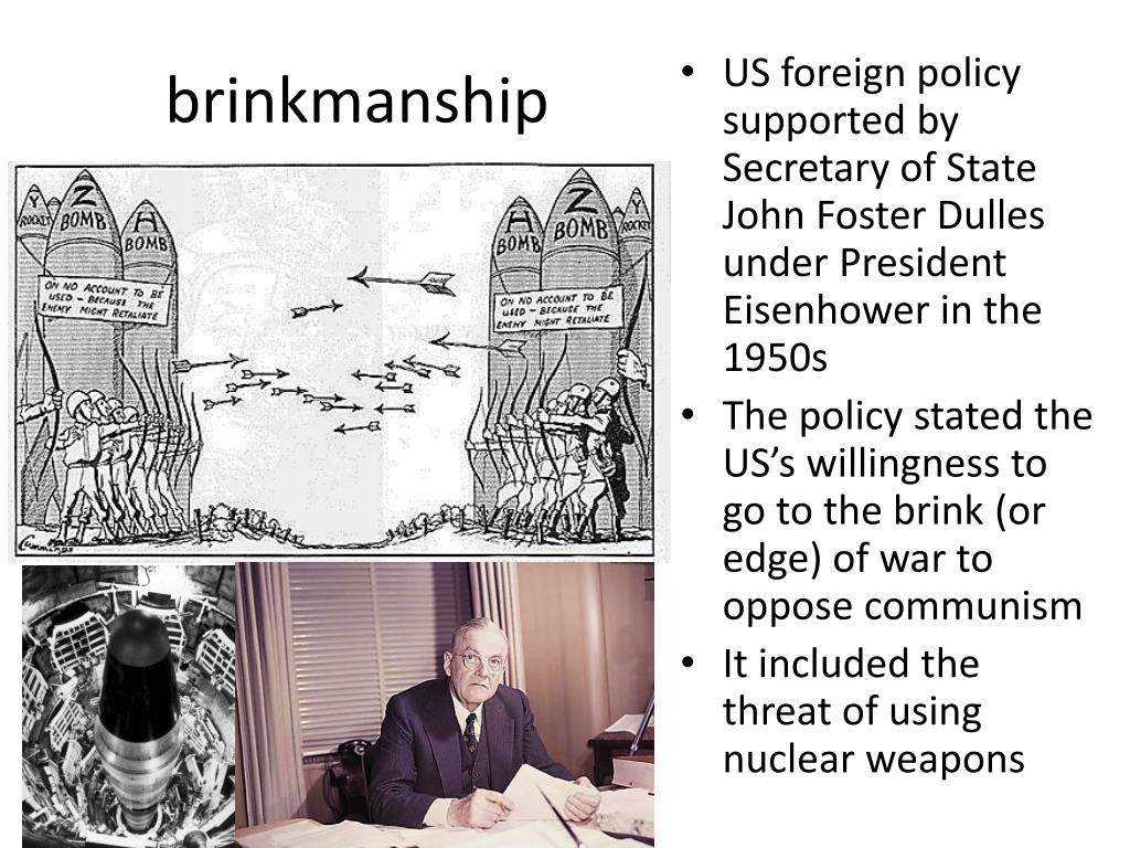 brinkmanship • US foreign policy supported by Secretary of State John Foster Dulles under President Eisenhower in the 1950s • The policy stated the US’s willingness to go to the brink (or edge) of war to oppose communism • It included the threat of using nuclear weapons