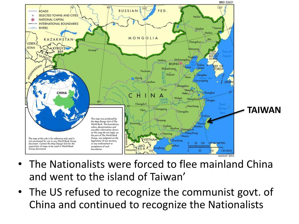 The Nationalists were forced to flee mainland China and went to the island of Taiwan’ • The US refused to recognize the communist govt. of China and continued to recognize the Nationalists TAIWAN