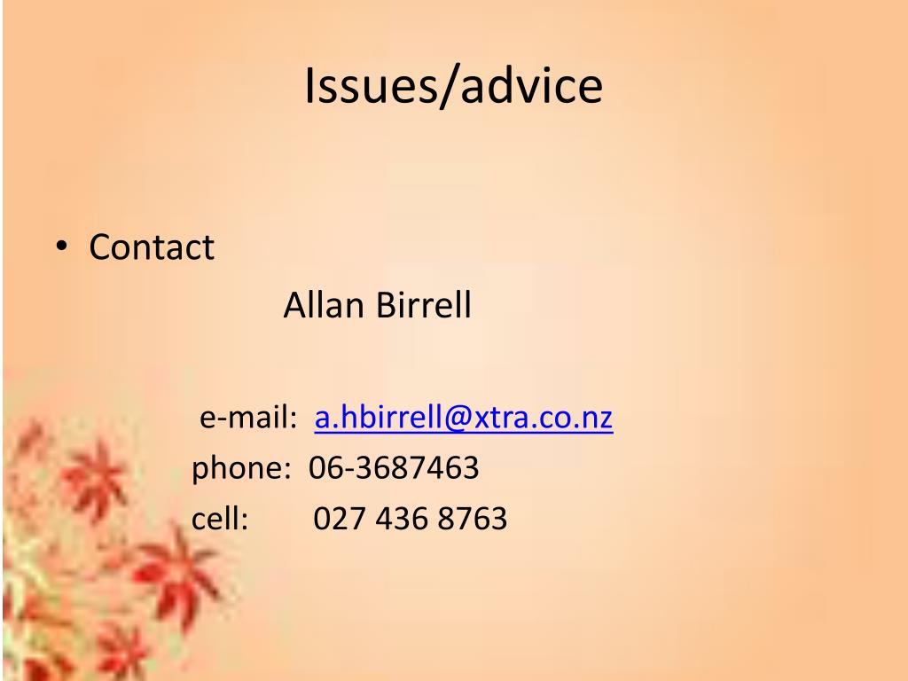 Issues/advice • Contact Allan Birrell e-mail: a.hbirrell@xtra.co.nz phone: 06-3687463 cell: 027 436 8763