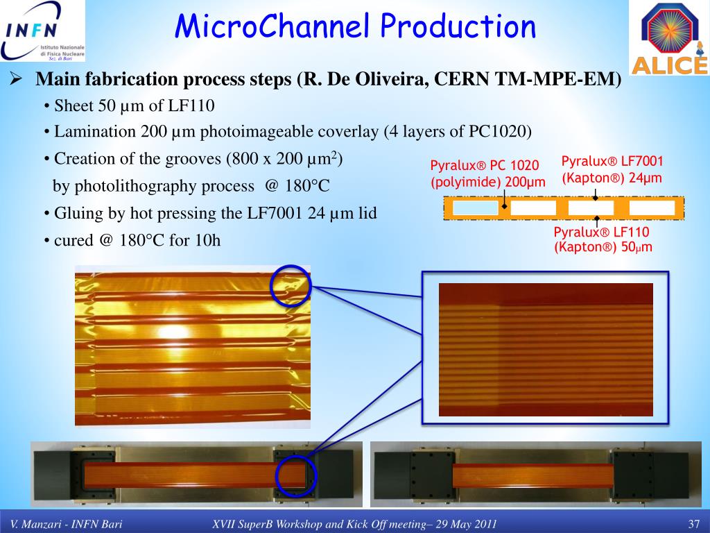 MicroChannel Production Pyralux® LF7001 (Kapton®) 24µm Pyralux® PC 1020 (polyimide) 200µm • Main fabrication process steps (R. De Oliveira, CERN TM-MPE-EM) • Sheet 50 µm of LF110 • Lamination 200 µm photoimageablecoverlay (4 layers of PC1020) • Creation of the grooves (800 x 200 µm2) • by photolithography process @ 180°C • Gluing by hot pressing the LF7001 24 µm lid • cured @ 180°C for 10h Pyralux® LF110 (Kapton®) 50µm XVII SuperB Workshop and Kick Off meeting– 29 May 2011
