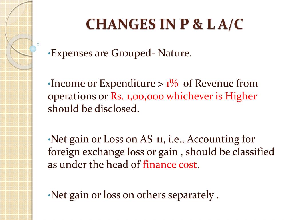 CHANGES IN P & L A/C Expenses are Grouped- Nature. Income or Expenditure > 1% of Revenue from operations or Rs. 1,00,000 whichever is Higher should be disclosed. Net gain or Loss on AS-11, i.e., Accounting for foreign exchange loss or gain , should be classified as under the head of finance cost. Net gain or loss on others separately .