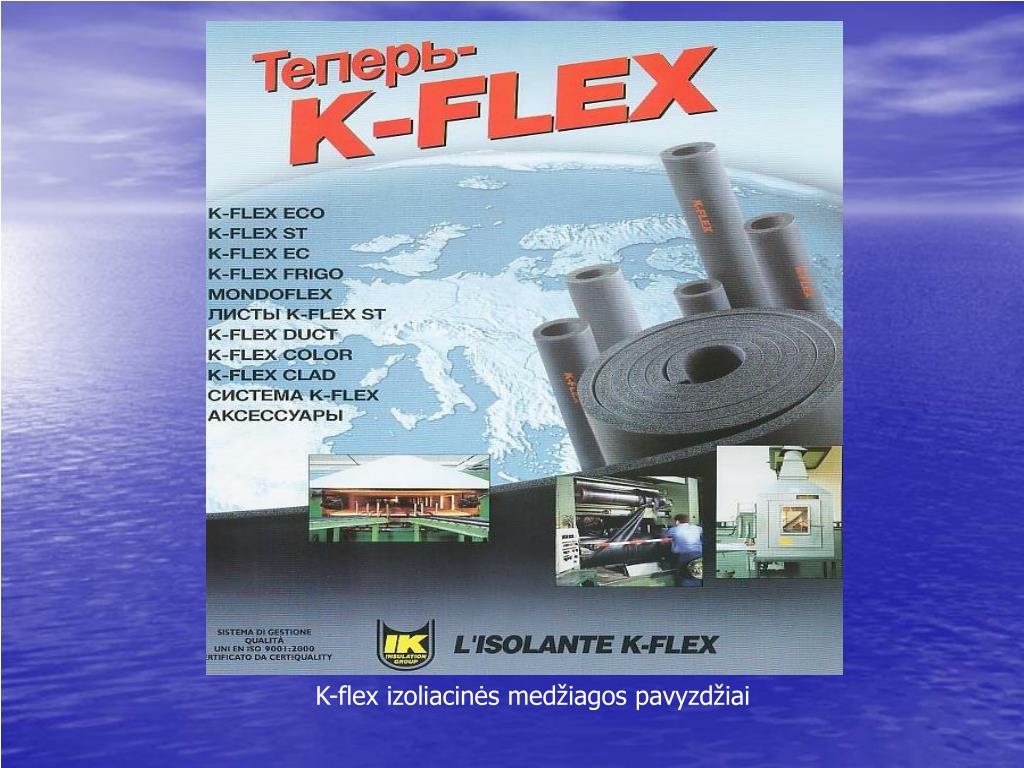 UAB “ Termomontažas” taip pat atstovauja Italijos įmonę L’isolante K-flex. Oficialus "L Isolante K-Flex" atstovas Lietuvoje siūlo Jums Izoliacinę medžiagą iš putinto uždarų porų sintetinio kaučiuko Termoizoliacinės medžiagos- lanksčios ir elastingos. Iš jų gaminami įvairaus skersmens vamzdeliai ir lakštai. Medžiagų savybės: puikus garų ir vandens nepralaidumas. mažas šilumos laidumas, nedegios, savaime užgęstančios, labai atsparios mikroorganizmams K- Flex ST Nepriekaištingos kokybės, puikiomis techninėmis savybėmis pasižyminti medžiaga, atitinkanti visus šaldymo įrenginių, šaltųjų vamzdynų ir talpų, oro kondicionavimo, ventiliacijos sistemų ir vandentekio izoliacijos reikalavimus. Šios rūšies medžiaga gali būti naudojama visur, kur reikalingos termoizoliacinės medžiagos, jos kaina visiškai atitinka kokybę. K - Flex EC Puikų techninių savybių medžiaga, naudojama šildymo sistemoms, karšto ir šalto vandens vandentiekiui, sanitarinėms ir oro kondicionavimo sistemoms izoliuoti.K- Flex EC medžiagųskersmuo- labai įvairus, kaina- nedidelė, todel yra naudojama daugelyje sričių. Lamela mineralinė vata.