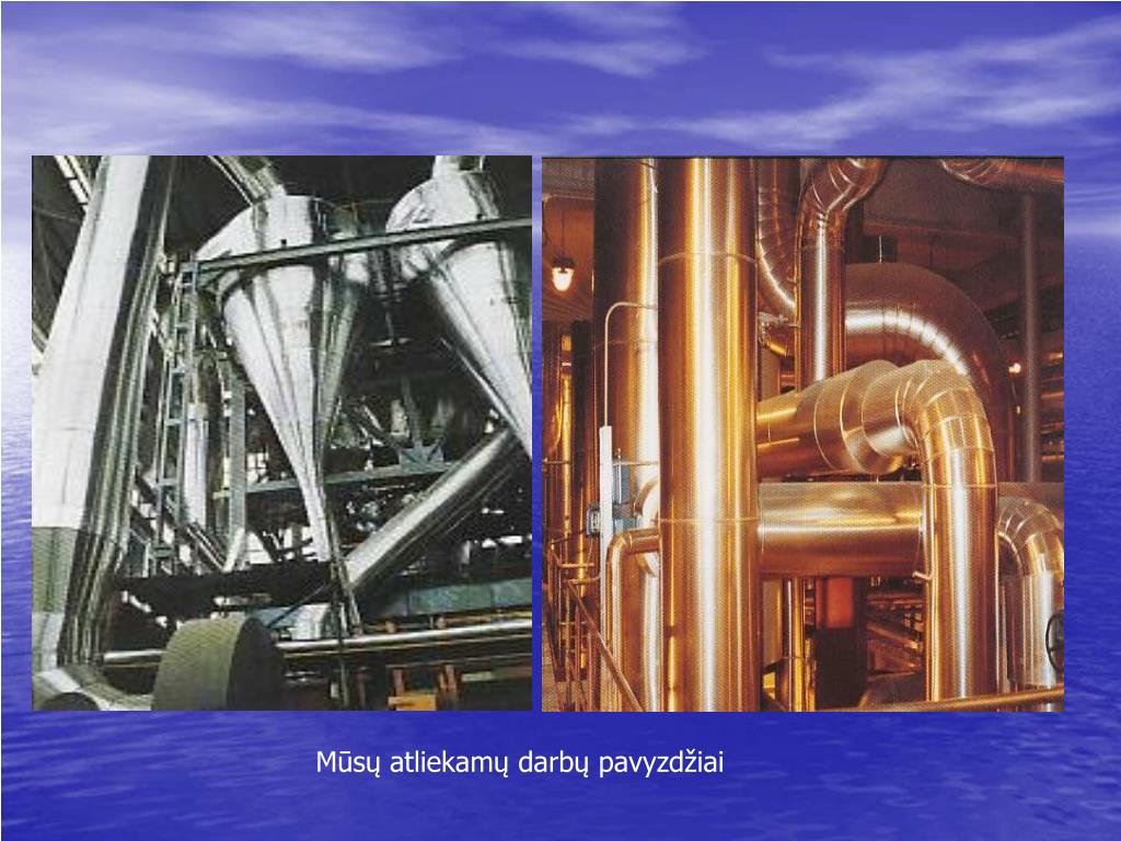 UAB “Termomontažas” atliekami darbai: • 1. Vėdinimo sistemų įrengimas • 2. Technologinių vamzdynų izoliavimo - apskardinimo darbai. • 3. Šaldymo kamerų izoliavimo –apskardinimo darbai. • a) plokščių ir kreivų paviršių izoliavimas • b) izoliacijos padengimas lakštiniu ir ruloniniu metalu. • c)aukštos ir žemos temperatūrų vamzdynų izoliavimas • d)požeminio vamzdyno izoliavimas • e)technologinių įrenginių izoliavimas • f)lakštinio metalo fasoninių detalių gamyba ir montavimas • g)paviršių valymas smėliasraute • h)paviršių padengimas gruntu bei antikoroziniais dažais.
