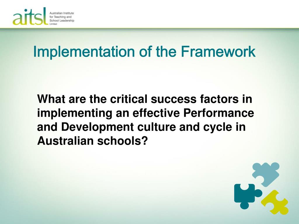Implementation of the Framework What are the critical success factors in implementing an effective Performance and Development culture and cycle in Australian schools?