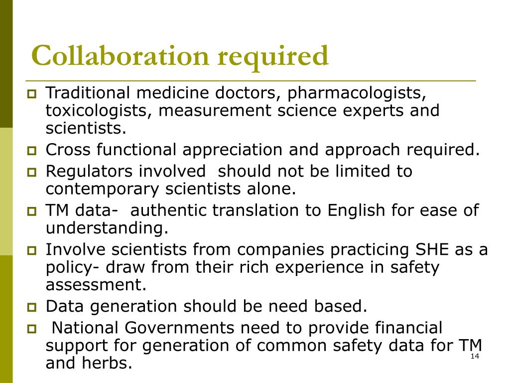 Collaboration required • Traditional medicine doctors, pharmacologists, toxicologists, measurement science experts and scientists. • Cross functional appreciation and approach required. • Regulators involved should not be limited to contemporary scientists alone. • TM data- authentic translation to English for ease of understanding. • Involve scientists from companies practicing SHE as a policy- draw from their rich experience in safety assessment. • Data generation should be need based. • National Governments need to provide financial support for generation of common safety data for TM and herbs.