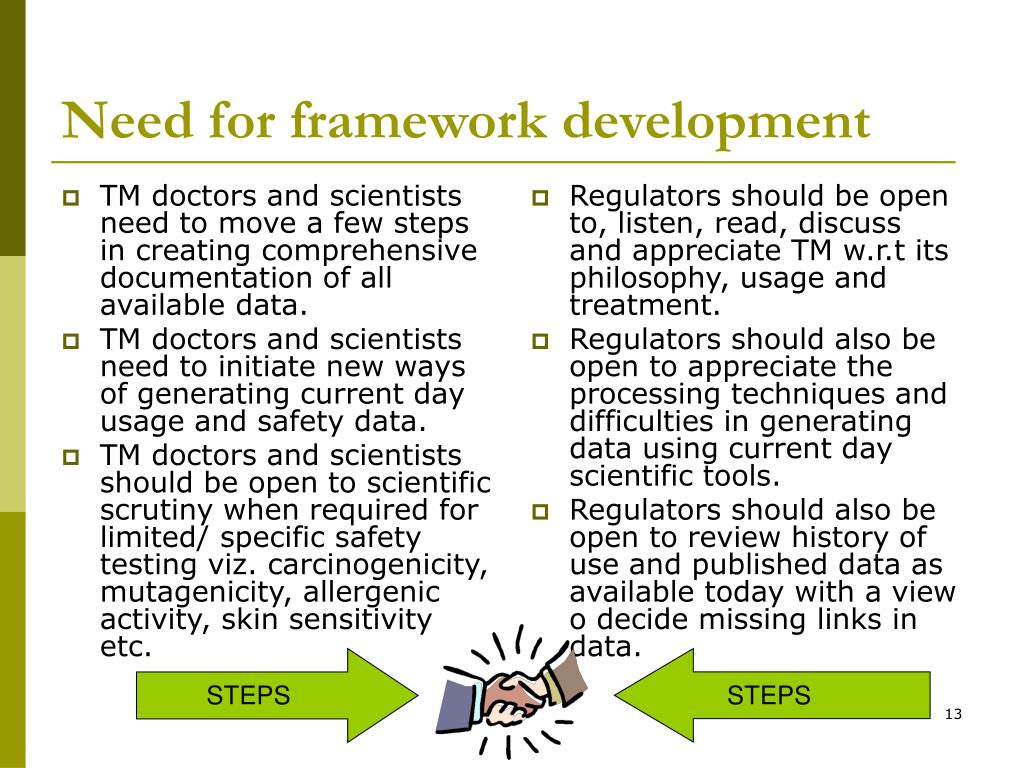 TM doctors and scientists need to move a few steps in creating comprehensive documentation of all available data. TM doctors and scientists need to initiate new ways of generating current day usage and safety data. TM doctors and scientists should be open to scientific scrutiny when required for limited/ specific safety testing viz. carcinogenicity, mutagenicity, allergenic activity, skin sensitivity etc. Regulators should be open to, listen, read, discuss and appreciate TM w.r.t its philosophy, usage and treatment. Regulators should also be open to appreciate the processing techniques and difficulties in generating data using current day scientific tools. Regulators should also be open to review history of use and published data as available today with a view o decide missing links in data. Need for framework development STEPS STEPS