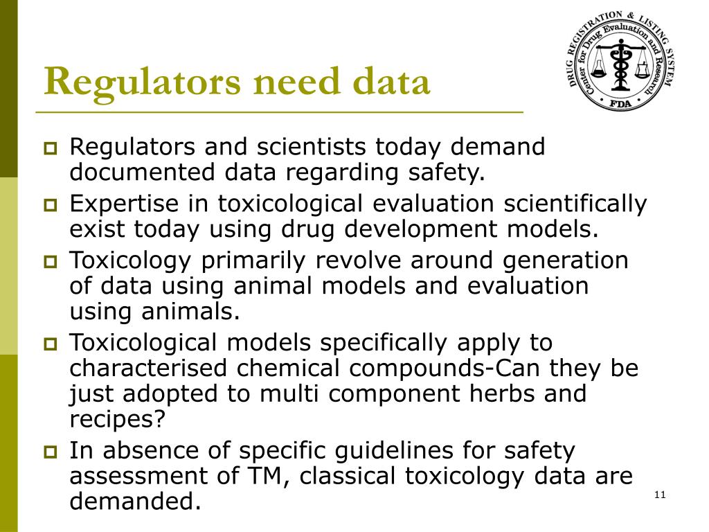 Regulators need data • Regulators and scientists today demand documented data regarding safety. • Expertise in toxicological evaluation scientifically exist today using drug development models. • Toxicology primarily revolve around generation of data using animal models and evaluation using animals. • Toxicological models specifically apply to characterised chemical compounds-Can they be just adopted to multi component herbs and recipes? • In absence of specific guidelines for safety assessment of TM, classical toxicology data are demanded.