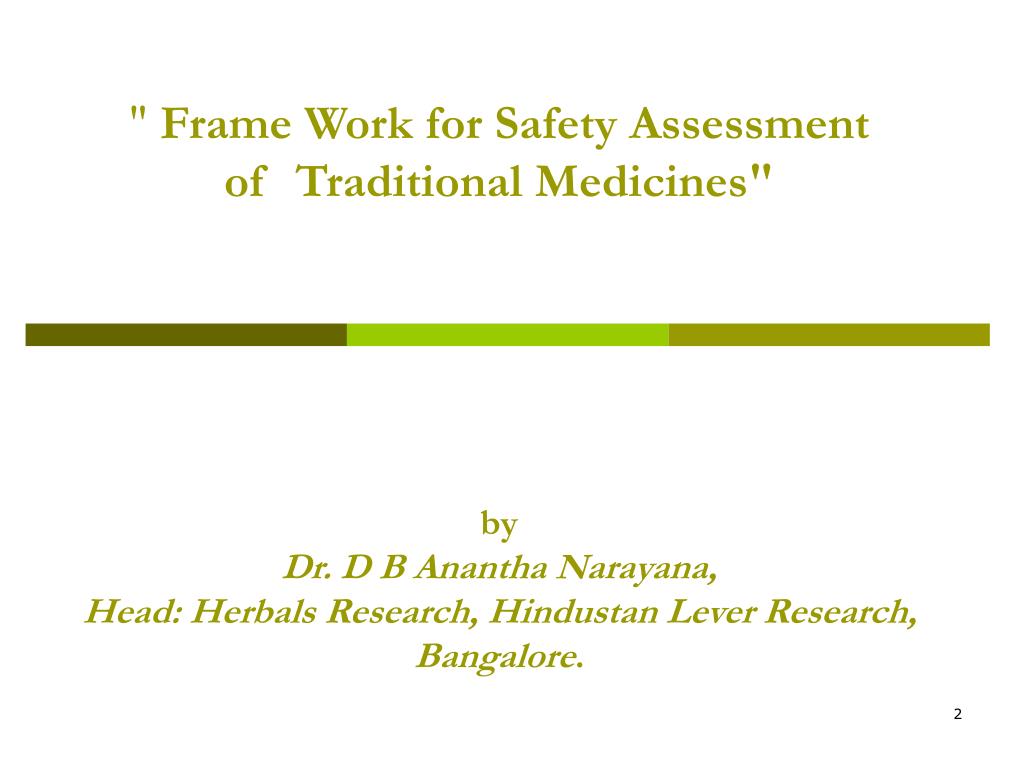 " Frame Work for Safety Assessment of Traditional Medicines" by Dr. D B Anantha Narayana, Head: Herbals Research, Hindustan Lever Research, Bangalore.