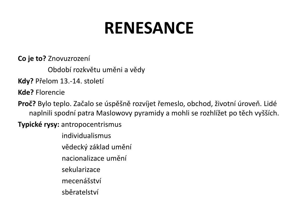 RENESANCE Co je to? Znovuzrození Období rozkvětu uměni a vědy Kdy? Přelom 13.-14. století Kde? Florencie Proč? Bylo teplo. Začalo se úspěšně rozvíjet řemeslo, obchod, životní úroveň. Lidé naplnili spodní patra Maslowovy pyramidy a mohli se rozhlížet po těch vyšších. Typické rysy: antropocentrismus individualismus vědecký základ umění nacionalizace umění sekularizace mecenášství sběratelství