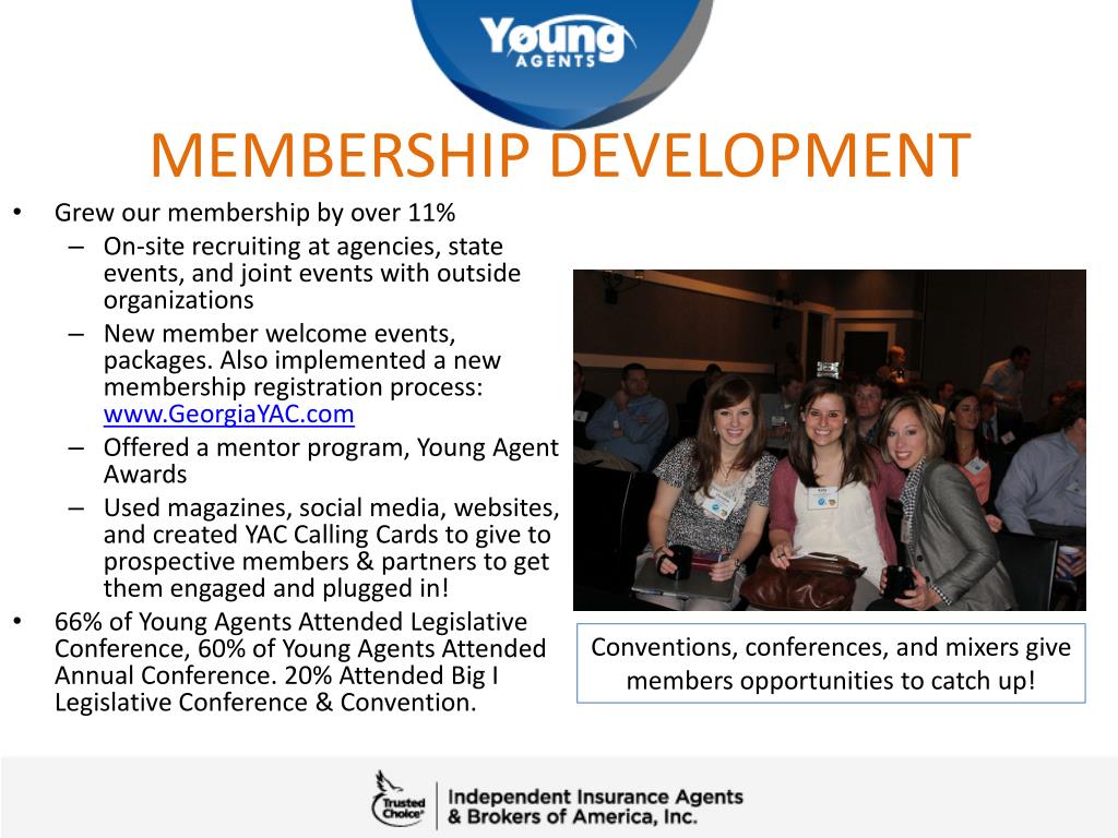 MEMBERSHIP DEVELOPMENT • Utilized online learning opportunities providing CE to Young Agents year-round • Contests on Facebook for conference registrations helps engage members while apart • Holds mixers and networking opportunities between state events to keep everyone plugged in • Most of all, our Young Agents have fun together! Part of the Group at YAC Sales & Leadership 2012