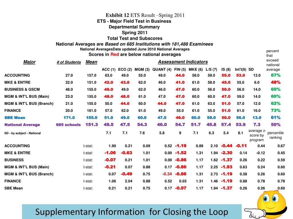 We are monitoring the assurance of learning results of Principles of Finance (FIN355) to ensure that the cross-sectional gap will be closed and the results of assessment will be consistent across sections. • We are monitoring the gap between our students’ ETS performance and the national average in the information technology area. According to the opinions of some committee members, this gap could be an indicator for curriculum change in the information technology area. • We currently research on the impact of increasing transfer students on our program. Some of the assessment committee members are concerned with this impact on our ETS results and this could be an area that we need for remedial actions if the evidence suggests so. • Some committee members expressed their concern regarding the workload for the instructor in teaching business ethics (BUS 203). We need to examine this workload issue to ensure that our learning goal can be addressed.