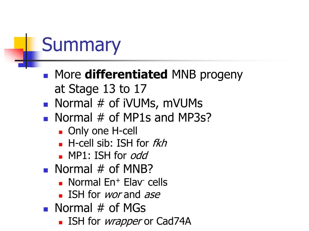 Summary • More differentiated MNB progeny at Stage 13 to 17 • Normal # of iVUMs, mVUMs • Normal # of MP1s and MP3s? • Only one H-cell • H-cell sib: ISH for fkh • MP1: ISH for odd • Normal # of MNB? • Normal En+ Elav- cells • ISH for wor and ase • Normal # of MGs • ISH for wrapper or Cad74A