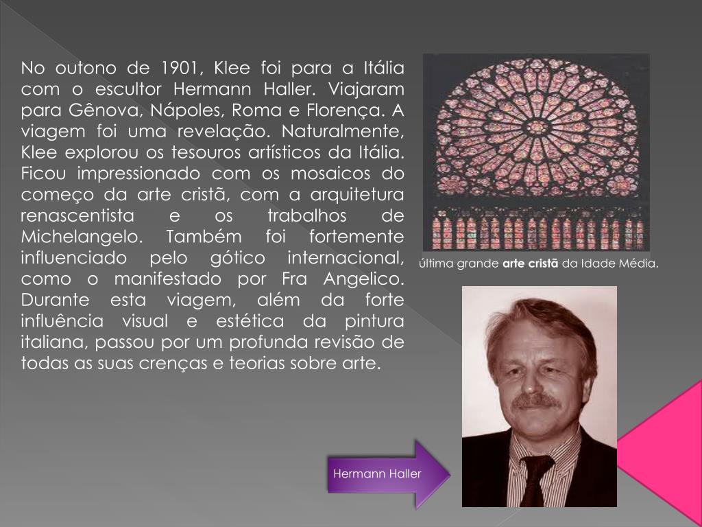 Paul Klee Paul Klee (Münchenbuchsee, 18 de dezembro de 1879 — Muralto, 29 de junho de 1940) foi um pintor e poeta suíço naturalizado alemão. O seu estilo, grandemente individual, foi influenciado por várias tendências artísticas diferentes, incluindo o expressionismo(movimento cultural de vanguarda), cubismo(movimento artístico), e surrealismo(movimento artístico e literário). Ele foi um estudante do orientalismo. Klee era um desenhista nato que realizou experimentos e, conseqüentemente, dominou a teoria das cores, sobre o quê ele escreveu extensivamente. Suas obras refletem seu humor seco e, às vezes, a sua perspectiva infantil, seus ânimos e suas crenças pessoais, e sua musicalidade. Ele e seu amigo, o pintor russo Wassily Kandinsky, também eram famosos por darem aulas na escola de arte e arquitetura Bauhaus. Paul Klee