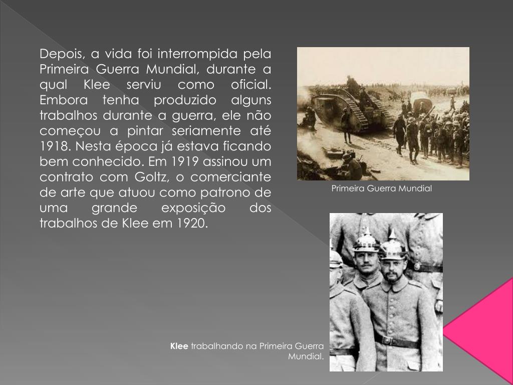 Depois, a vida foi interrompida pela Primeira Guerra Mundial, durante a qual Klee serviu como oficial. Embora tenha produzido alguns trabalhos durante a guerra, ele não começou a pintar seriamente até 1918. Nesta época já estava ficando bem conhecido. Em 1919 assinou um contrato com Goltz, o comerciante de arte que atuou como patrono de uma grande exposição dos trabalhos de Klee em 1920. Primeira Guerra Mundial Klee trabalhando na Primeira Guerra Mundial.