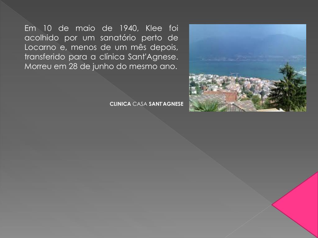 Em 10 de maio de 1940, Klee foi acolhido por um sanatório perto de Locarno e, menos de um mês depois, transferido para a clínica Sant'Agnese. Morreu em 28 de junho do mesmo ano. CLINICA CASA SANT'AGNESE