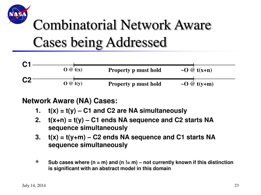 Combinatorial Network Aware Cases being Addressed C1 C2 Network Aware (NA) Cases: • t(x) = t(y) – C1 and C2 are NA simultaneously • t(x+n) = t(y) – C1 ends NA sequence and C2 starts NA sequence simultaneously • t(x) = t(y+m) – C2 ends NA sequence and C1 starts NA sequence simultaneously • Sub cases where (n = m) and (n != m) – not currently known if this distinction is significant with an abstract model in this domain O @ t(x) Property p must hold ~O @ t(x+n) O @ t(y) Property p must hold ~O @ t(y+m)