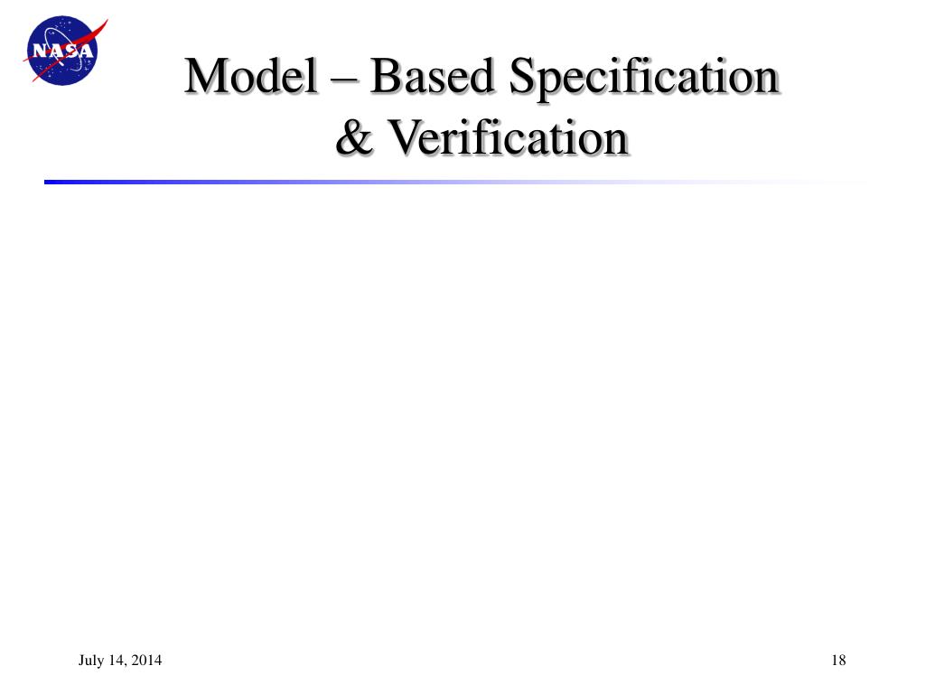 Model Checking: A Case Study Simplified State Machine for Prime PRIME Prime init suspend BACKUP PRIME NOMINAL SEQUENCE IDLE System fault protection (SFP) Response Active Power-up Idle Fault Idle SFP Response Done Resume from mark point Done Activate SFP ACTIVE SEQUENCE CRITICAL “Validating Requirements for Fault Tolerant Systems Using Model Checking”, Schneider, Callahan & Easterbrook, 1998 This Case Study was funded by the NASA Software Program at the NASA IV&V Facility and JPL under a separate task