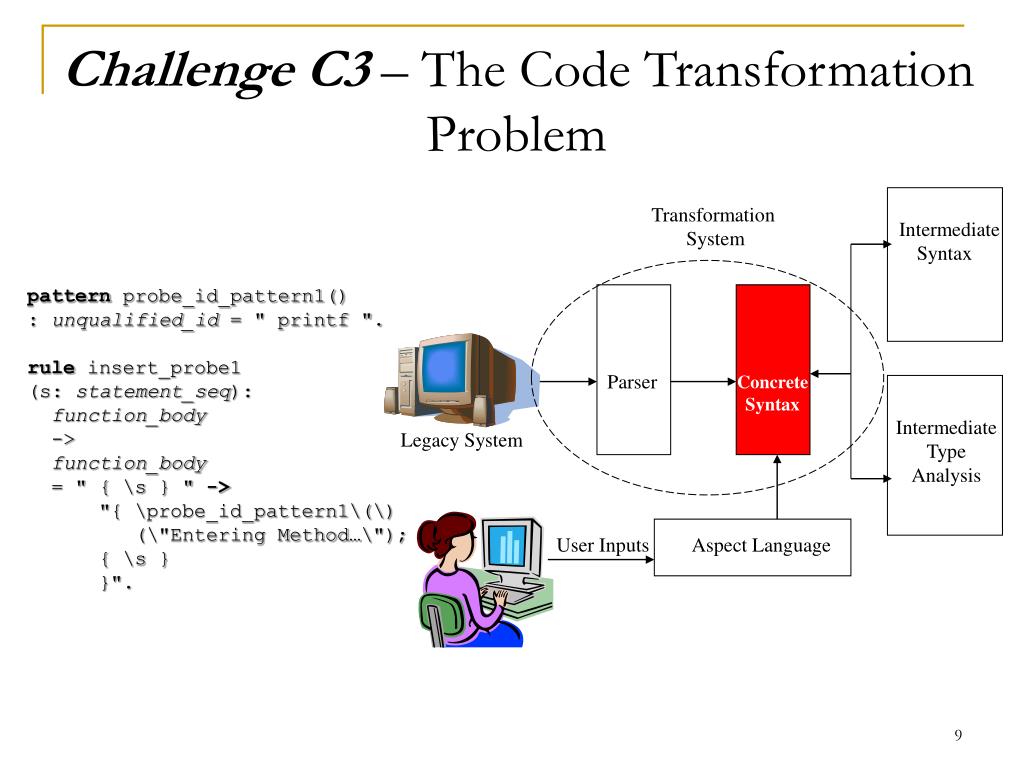 Transformation System Parser Concrete Syntax Legacy System User Inputs Aspect Language Challenge C3 – The Code Transformation Problem Intermediate Syntax pattern probe_id_pattern1() : unqualified_id = " printf ". rule insert_probe1 (s: statement_seq): function_body -> function_body = " { \s } " -> "{ \probe_id_pattern1\(\) (\"Entering Method…\"); { \s } }". Intermediate Type Analysis