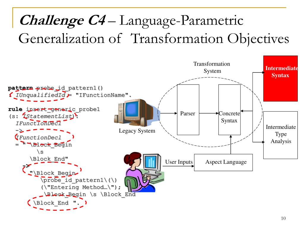 Transformation System Parser Concrete Syntax Legacy System User Inputs Aspect Language Challenge C4 – Language-Parametric Generalization of Transformation Objectives Intermediate Syntax pattern probe_id_pattern1() : IUnqualifiedId = "IFunctionName". rule insert_generic_probe1 (s: IStatementList): IFunctionDecl -> IFunctionDecl = " \Block_Begin \s \Block_End" -> "\Block_Begin \probe_id_pattern1\(\) (\"Entering Method…\"); \Block_Begin\s \Block_End \Block_End". Intermediate Type Analysis