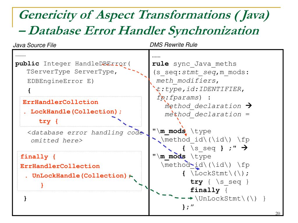Genericity of Aspect Transformations ( Java) – Database Error Handler Synchronization DMS Rewrite Rule Java Source File …… • rule sync_Java_meths (s_seq:stmt_seq,m_mods:meth_modifiers, • t:type,id:IDENTIFIER, • fp:fparams) : • method_declaration • method_declaration = • "\m_mods \type • \method_id\(\id\) \fp • { \s_seq } ;" • "\m_mods \type • \method_id\(\id\) \fp • { \LockStmt\(\); • try { \s_seq } • finally { • \UnLockStmt\(\) } • };” ……… public Integer HandleDBError( TServerType ServerType, EDBEngineError E) { <database error handling code omitted here> } ErrHandlerCollction . LockHandle(Collection); try { finally { ErrHandlerCollection . UnLockHandle(Collection); }