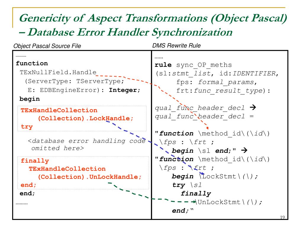 Genericity of Aspect Transformations (Object Pascal) – Database Error Handler Synchronization DMS Rewrite Rule Object Pascal Source File …… rule sync_OP_meths (sl:stmt_list, id:IDENTIFIER, fps: formal_params, frt:func_result_type): qual_func_header_decl qual_func_header_decl = "function \method_id\(\id\) \fps : \frt ; begin \sl end;" "function \method_id\(\id\) \fps : \frt ; begin \LockStmt\(\); try \sl finally \UnLockStmt\(\); end;“ ……… function TExNullField.Handle (ServerType: TServerType; E: EDBEngineError): Integer; begin <database error handling code omitted here> end; ……… TExHandleCollection (Collection).LockHandle; try finally TExHandleCollection (Collection).UnLockHandle; end;