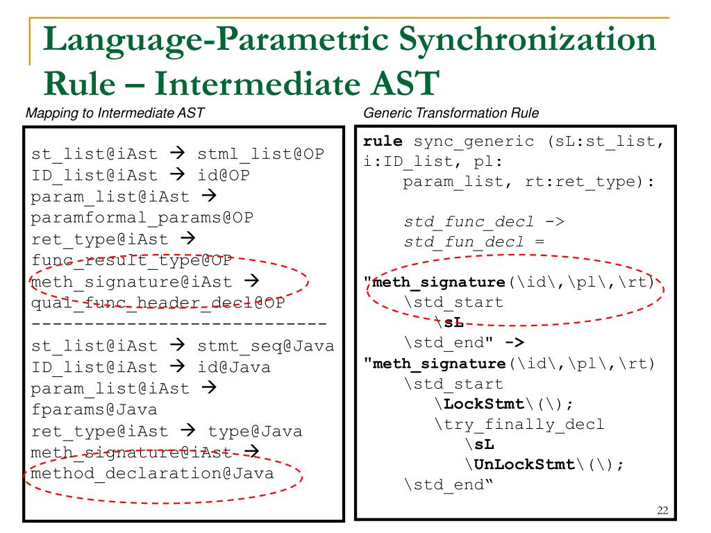 Language-Parametric Synchronization Rule – Intermediate AST Mapping to Intermediate AST Generic Transformation Rule rule sync_generic (sL:st_list, i:ID_list, pl: param_list, rt:ret_type): std_func_decl -> std_fun_decl = "meth_signature(\id\,\pl\,\rt) \std_start \sL \std_end" -> "meth_signature(\id\,\pl\,\rt) \std_start \LockStmt\(\); \try_finally_decl \sL \UnLockStmt\(\); \std_end“ st_list@iAst stml_list@OP ID_list@iAst id@OP param_list@iAst paramformal_params@OP ret_type@iAst func_result_type@OP meth_signature@iAst qual_func_header_decl@OP ---------------------------- st_list@iAst stmt_seq@Java ID_list@iAst id@Java param_list@iAst fparams@Java ret_type@iAst type@Java meth_signature@iAst method_declaration@Java