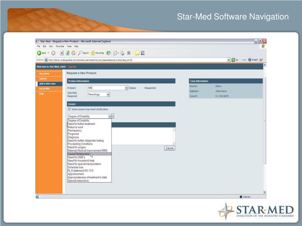 The Technology • Information Flow ChartStar-Med Style • The paperwork from the case and the package of x-rays and MRI/CT scans comes to Star-Med. • The paper documents get organized, scanned and placed in digital booklets, organized by sections for all consultants and for the client to review. • Radiological studies are scanned by our x-ray digitizing system and placed on our Remote PACS system to transfer to our Radiologists panel for review. • The patient's entire case is loaded on the server. • The series of IME's, peer-reviews, and radiological reviews are scheduled. • Our panel and client have simultaneous and 24/7 access to the document management system to prepare the IME. • The IME/Peer-review/Radiological review is performed and attached to the digital chart. • The entire case is now complete, digitized, viewable, and electronically transferable. • Case Compilation CD/DVD for Client Use.