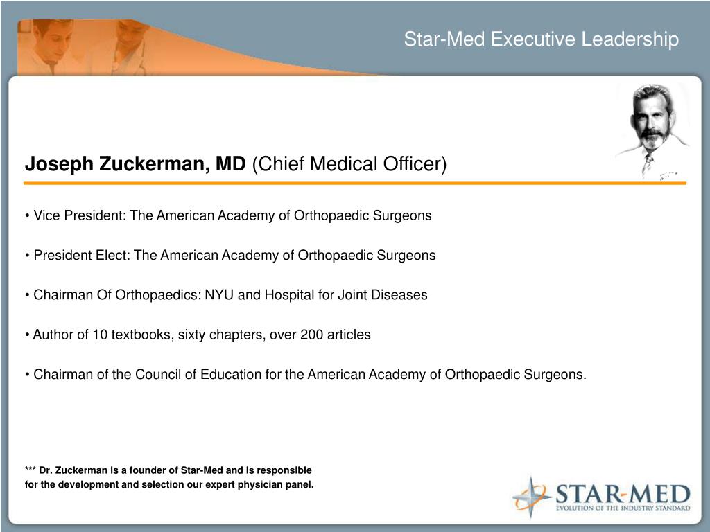 Star-Med Executive Leadership • Joseph Zuckerman, MD (Chief Medical Officer) • Vice President: The American Academy of Orthopaedic Surgeons • President Elect: The American Academy of Orthopaedic Surgeons • Chairman Of Orthopaedics: NYU and Hospital for Joint Diseases • Author of 10 textbooks, sixty chapters, over 200 articles • Chairman of the Council of Education for the American Academy of Orthopaedic Surgeons. • *** Dr. Zuckerman is a founder of Star-Med and is responsible • for the development and selection our expert physician panel.