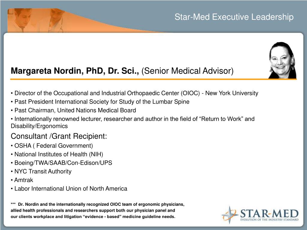 Star-Med Executive Leadership • Margareta Nordin, PhD, Dr. Sci., (Senior Medical Advisor) • Director of the Occupational and Industrial Orthopaedic Center (OIOC) - New York University • Past President International Society for Study of the Lumbar Spine • Past Chairman, United Nations Medical Board • Internationally renowned lecturer, researcher and author in the field of “Return to Work” and Disability/Ergonomics • Consultant /Grant Recipient: • OSHA ( Federal Government) • National Institutes of Health (NIH) • Boeing/TWA/SAAB/Con-Edison/UPS • NYC Transit Authority • Amtrak • Labor International Union of North America • *** Dr. Nordin and the internationally recognized OIOC team of ergonomic physicians, • allied health professionals and researchers support both our physician panel and • our clients workplace and litigation “evidence - based” medicine guideline needs.