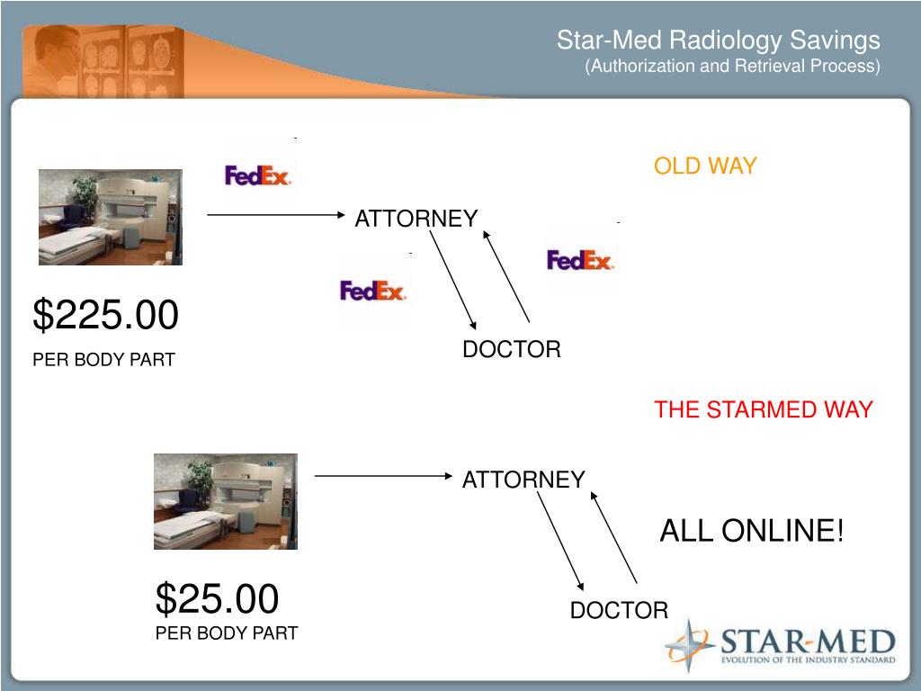 ATTORNEY DOCTOR Star-Med Radiology Savings(Authorization and Retrieval Process) OLD WAY ATTORNEY $225.00 PER BODY PART DOCTOR THE STARMED WAY ALL ONLINE! $25.00 PER BODY PART