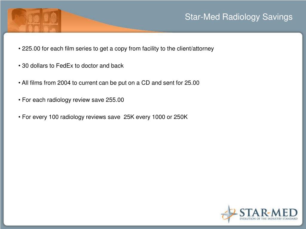 Star-Med Radiology Savings • 225.00 for each film series to get a copy from facility to the client/attorney • 30 dollars to FedEx to doctor and back • All films from 2004 to current can be put on a CD and sent for 25.00 • For each radiology review save 255.00 • For every 100 radiology reviews save 25K every 1000 or 250K