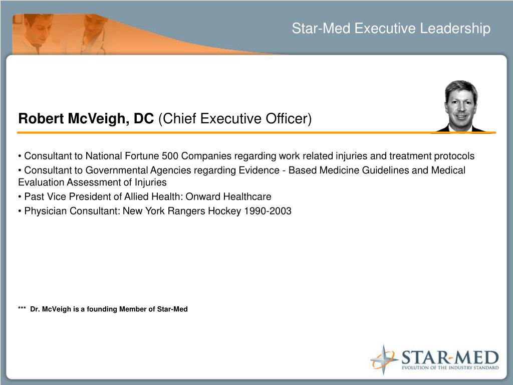 Star-Med Executive Leadership • Robert McVeigh, DC (Chief Executive Officer) • Consultant to National Fortune 500 Companies regarding work related injuries and treatment protocols • Consultant to Governmental Agencies regarding Evidence - Based Medicine Guidelines and Medical Evaluation Assessment of Injuries • Past Vice President of Allied Health: Onward Healthcare • Physician Consultant: New York Rangers Hockey 1990-2003 • *** Dr. McVeigh is a founding Member of Star-Med