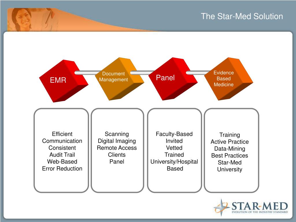 The Star-Med Solution Evidence Based Medicine Document Management Panel EMR Efficient Communication Consistent Audit Trail Web-Based Error Reduction Scanning Digital Imaging Remote Access Clients Panel Faculty-Based Invited Vetted Trained University/Hospital Based Training Active Practice Data-Mining Best Practices Star-Med University