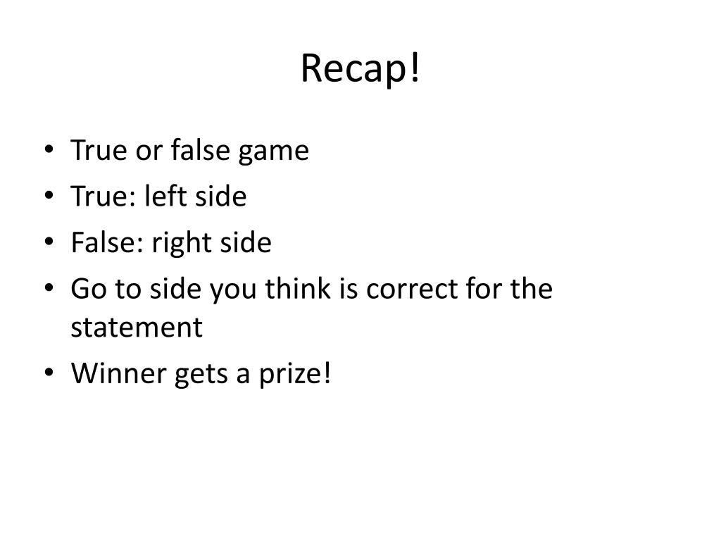 Recap! • True or false game • True: left side • False: right side • Go to side you think is correct for the statement • Winner gets a prize!