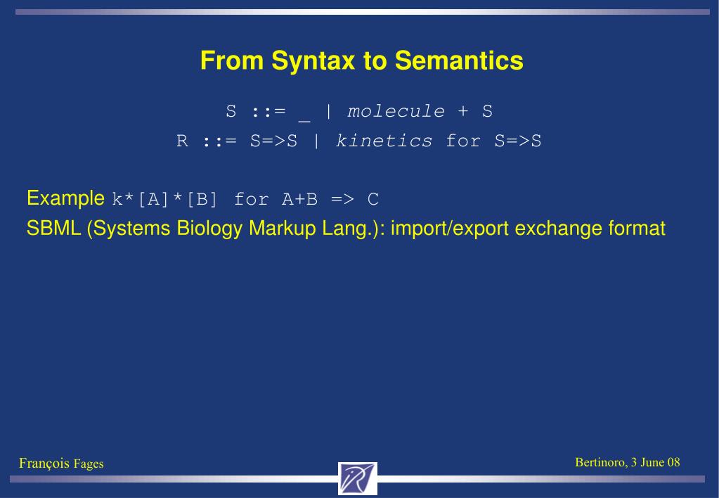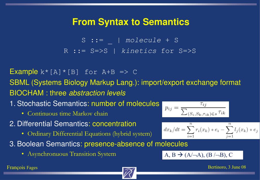 From Syntax to Semantics • S ::= _ | molecule + S • R ::= S=>S | kinetics for S=>S • Example k*[A]*[B] for A+B => C • SBML (Systems Biology Markup Lang.): import/export exchange format