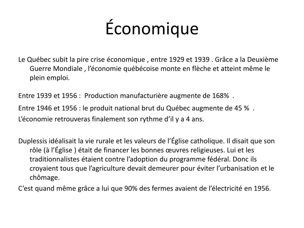 Économique Le Québec subit la pire crise économique , entre 1929 et 1939 . Grâce a la Deuxième Guerre Mondiale , l’économie québécoise monte en flèche et atteint même le plein emploi. Entre 1939 et 1956 : Production manufacturière augmente de 168%. Entre 1946 et 1956 : le produit national brut du Québec augmente de 45 % . L’économie retrouveras finalement son rythme d’il y a 4 ans. Duplessis idéalisait la vie rurale et les valeurs de l’Église catholique. Il disait que son rôle (à l’Église ) était de financer les bonnes œuvres religieuses. Lui et les traditionnalistes étaient contre l’adoption du programme fédéral. Donc ils croyaient tous que l’agriculture devait demeurer pour éviter l’urbanisation et le chômage. C’est quand même grâce a lui que 90% des fermes avaient de l’électricité en 1956.