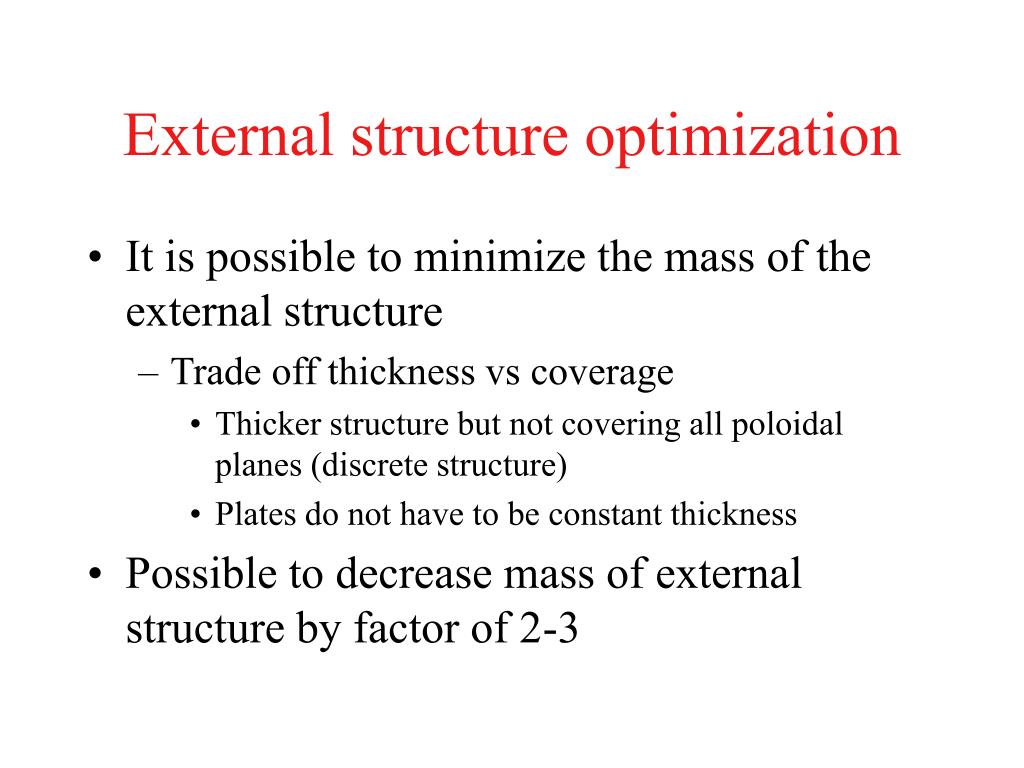External structure optimization • It is possible to minimize the mass of the external structure • Trade off thickness vs coverage • Thicker structure but not covering all poloidal planes (discrete structure) • Plates do not have to be constant thickness • Possible to decrease mass of external structure by factor of 2-3