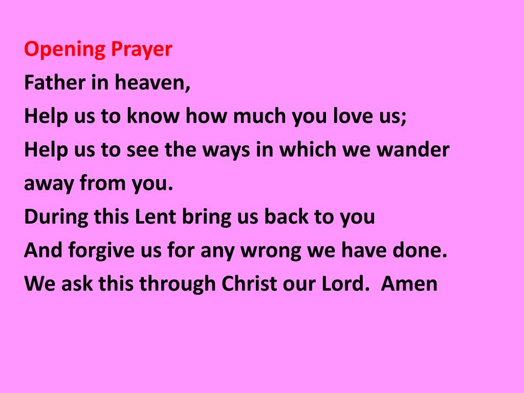 Opening Prayer Father in heaven, Help us to know how much you love us; Help us to see the ways in which we wander away from you. During this Lent bring us back to you And forgive us for any wrong we have done. We ask this through Christ our Lord. Amen