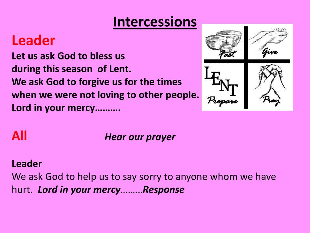 Intercessions Leader Let us ask God to bless us during this season of Lent. We ask God to forgive us for the times when we were not loving to other people. Lord in your mercy………. AllHear our prayer Leader We ask God to help us to say sorry to anyone whom we have hurt. Lord in your mercy………Response