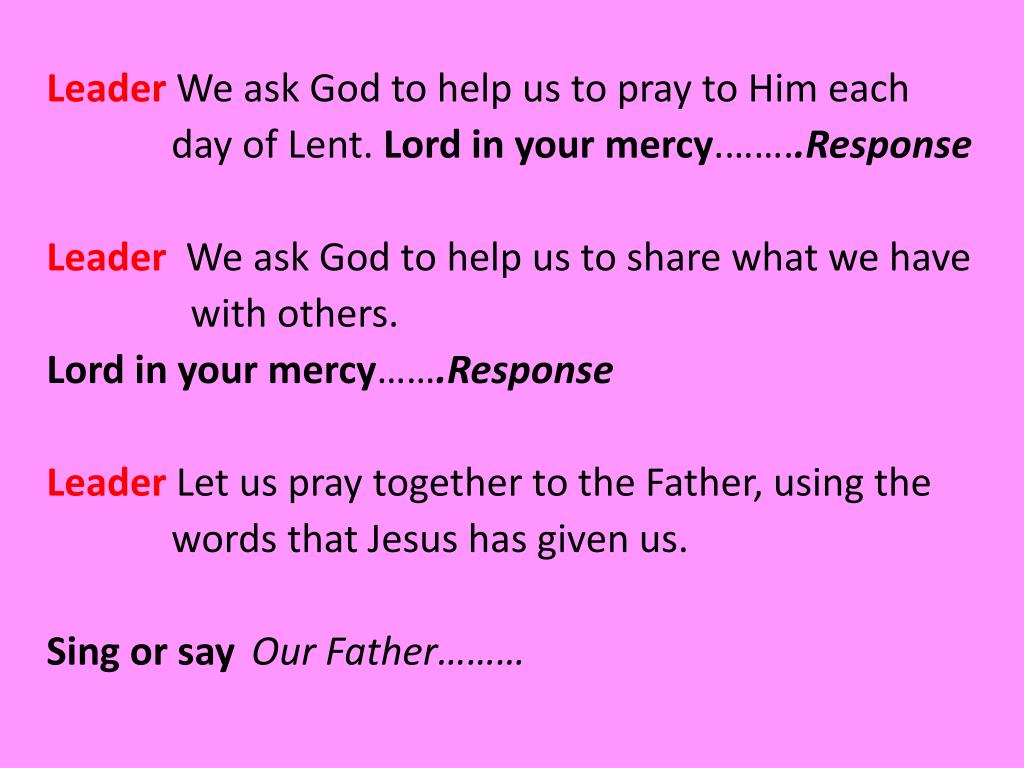 LeaderWe ask God to help us to pray to Him each day of Lent. Lord in your mercy.……..Response Leader We ask God to help us to share what we have with others. Lord in your mercy…….Response LeaderLet us pray together to the Father, using the words that Jesus has given us. Sing or sayOur Father………