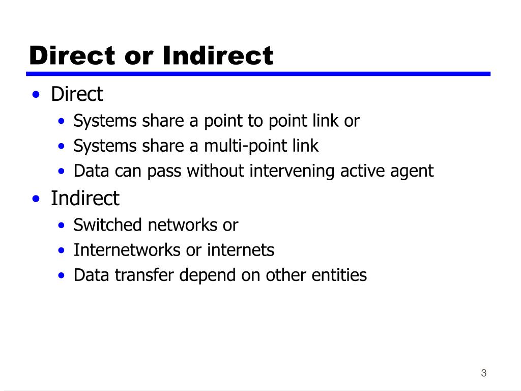 Direct or Indirect • Direct • Systems share a point to point link or • Systems share a multi-point link • Data can pass without intervening active agent • Indirect • Switched networks or • Internetworks or internets • Data transfer depend on other entities