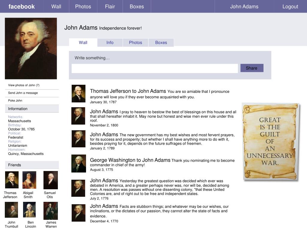 Wall Photos Flair Boxes John Adams Logout Wall Info Photos Boxes Basic Information Networks:Massachusetts Sex: Male Birthday:October 30, 1785 Hometown:Quincy, Massachusetts Relationship Status: Married to Abigail Smith Political Views:Federalist Religious Views:Unitarianism facebook “Fear is the foundation of most governments. View photos of John (7) Send John a message Poke John Personal Information Information Activities:Walking, Writing, Discussing history, religion, and law Interests:Studying law Favorite Music:Amazing Grace, Coronation, Evangelical Harmony, Plain Psalmody Favorite Books:A Tale of Two Cities, The Mysteries of Udolpho , Confessions Favorite Quotations: “There are two types of education... One should teach us how to make a living, And the other how to live.” About Me:Let us dare to read, think, speak and write. Networks: Massachusetts Birthday: October 30, 1785 Political: Federalist Religion: Unitarianism Hometown: Quincy, Massachusetts John Adams Independence forever! Education and Work Photos Education College: Harvard Law School High School:Joseph Marsh School Work Employer: United States of America Position: President Time Period: 1797-1801 Location: Washington, DC 2 Albums Friends and Family Updated last Tuesday Quincy, Massachusetts Updated two months ago Contact Information Address: Quincy, Massachusetts